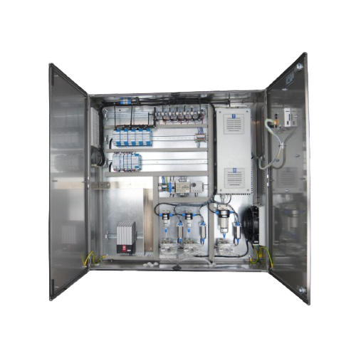 Para montaje en pared, opcional con soporte y cubierta de protección contra la intemperie (exterior). Temperatura de instalación: Interior de +5 a +40 °C, respectivamente, exterior/EX de 25 a +45 °C/55 °C. Temperatura del gas: de +5 a +40 °C, opcional hasta +70 °C (funcionamiento con refrigerador de gas). - SPS y pantalla táctil a color de 4,3″ o 7″ (opcional) en la puerta o montada en el interior del armario, con conexiones para mangueras de plástico o tuberías de acero inoxidable.
